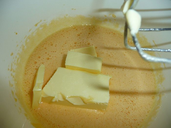Яйца взбить с сахаром, ванильным сахаром, добавить мягкое сливочное масло.