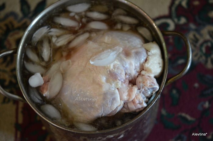 Добавить в кастрюлю с рассолом промытую индюшку грудкой вниз ногами вверх, очищенную от внутренностей, ледяную воду (у меня кастрюля хоть и большая, но ледяную воду уже не вместила, добавила лишь стакан льда). Для тех, кто также использует только рассол, сократите количество соли. Закрыть ее сверху и поставить в холодильник на 8-16 часов. За эти промежутки переверните ее еще раза два.
