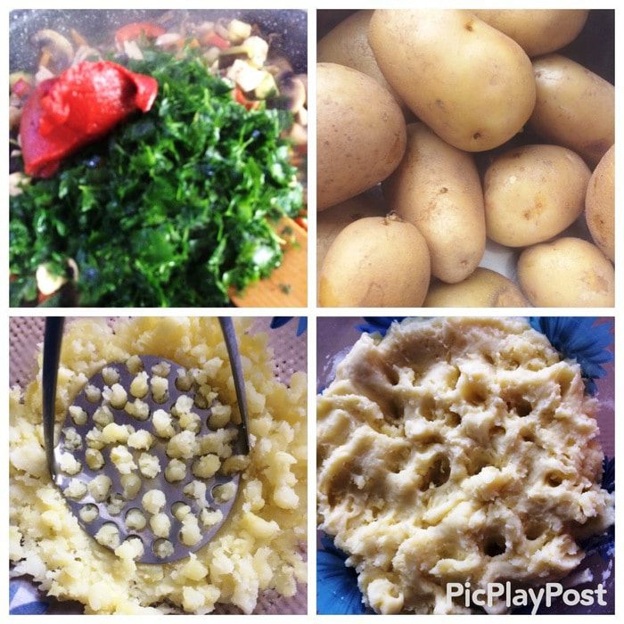 Вареный картофель чистим и разминаем. Добавляем оливковое масло, соль, 2 чубчика толченного чеснока и яичный белок. Все тщательно перемешиваем (я воспользовалась погружным блендером).