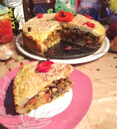 Обсыпаем тертым пармезаном и закрываем начинку оставшимся пюре. Смазываем запеканку желтком и при желании обсыпаем кунжутом.