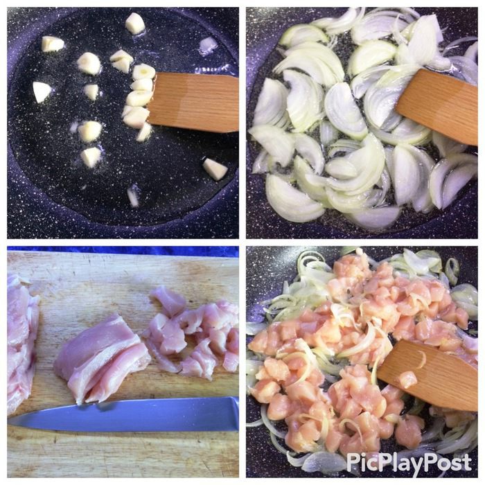 Пока варится картофель готовим начинку для запеканки. Разогреем сковороду с оливковым маслом, припустим в нем 2 дольки чеснока для аромата. Вынимаем чеснок и отправляем нарезанную луковицу обжариваться до прозрачности (у меня полукольцами нарезан). Нарезаем кубиком куриное филе и отправляем к луку.