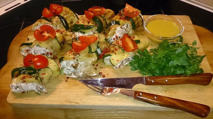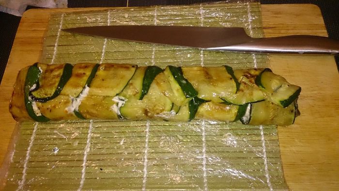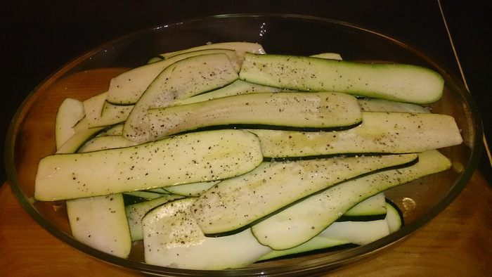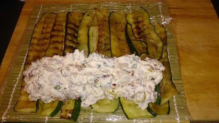Выкладываем полоски цукини внахлест и выкладываем сверху начинку.