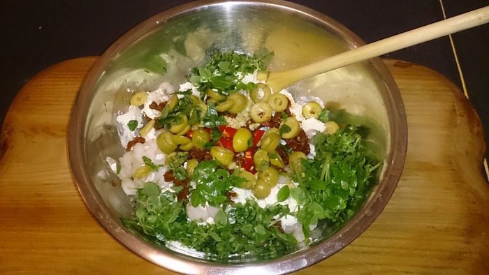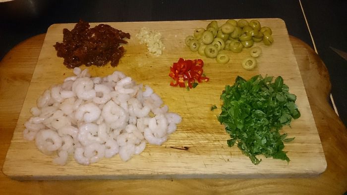 Подготавливаем все для начинки, рубим базилик, оливки, чили (по желанию), чеснок, вяленые томаты, креветки (у меня коктейльные, я положил целиком).