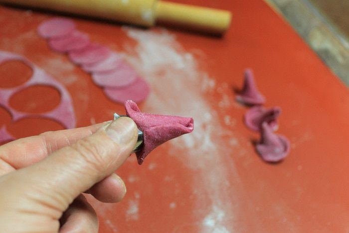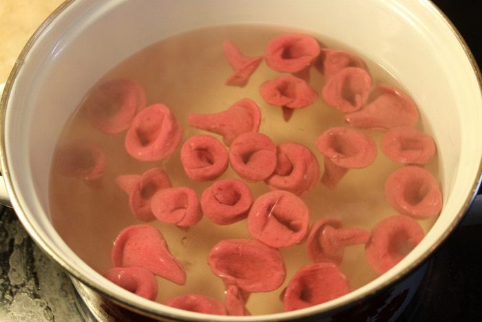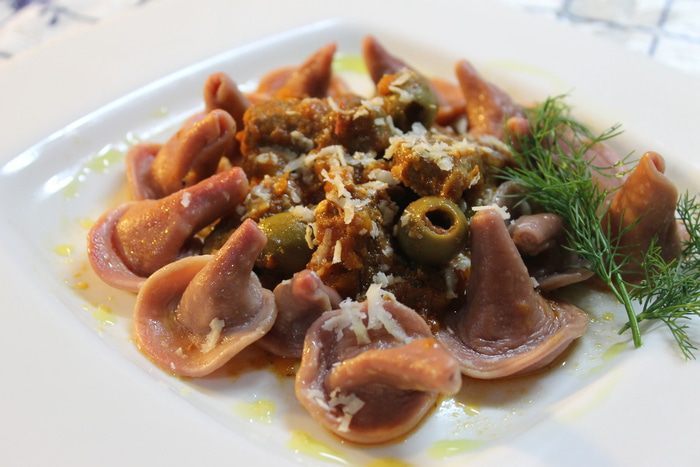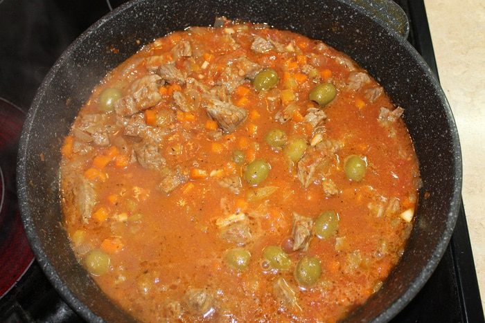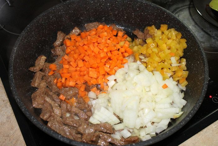 Паста готова, приступим к приготовлению мясного рагу, которое будем подавать вместе с пастой. Мясо нарежьте тонкими длинными брусочками. В сотейник налейте пару ложек оливкового масла, положите мясо и обжаривайте на медленном огне в течение 45 минут, пока не испарится вся жидкость.