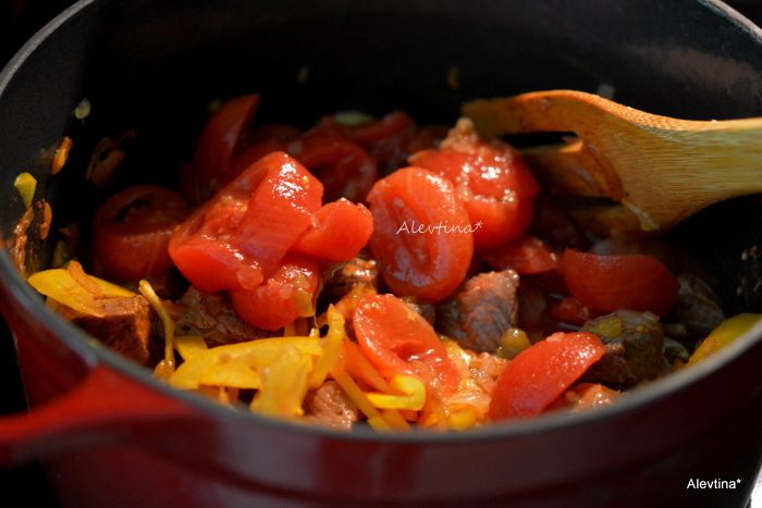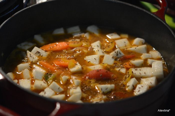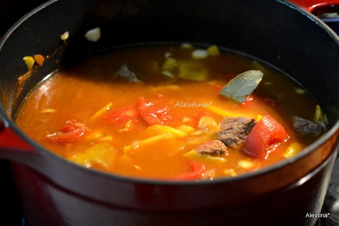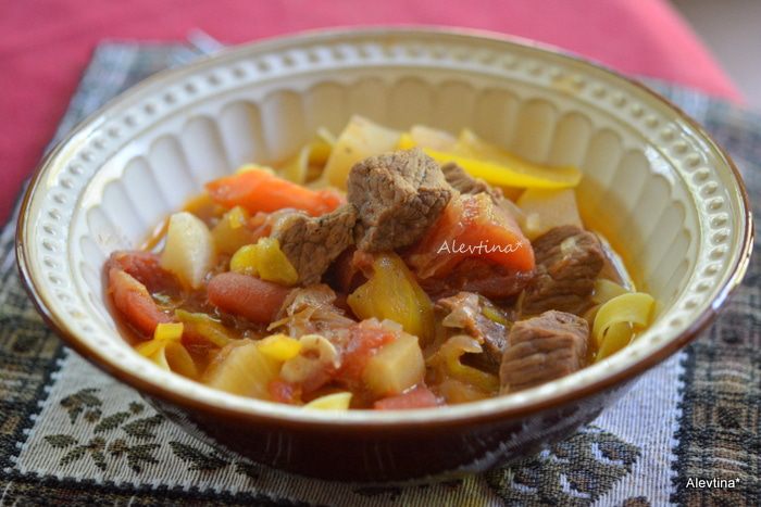 Добавить воды так, чтобы прикрывало овощи или бульон, закрыть крышкой и тушить 1,5 часа.