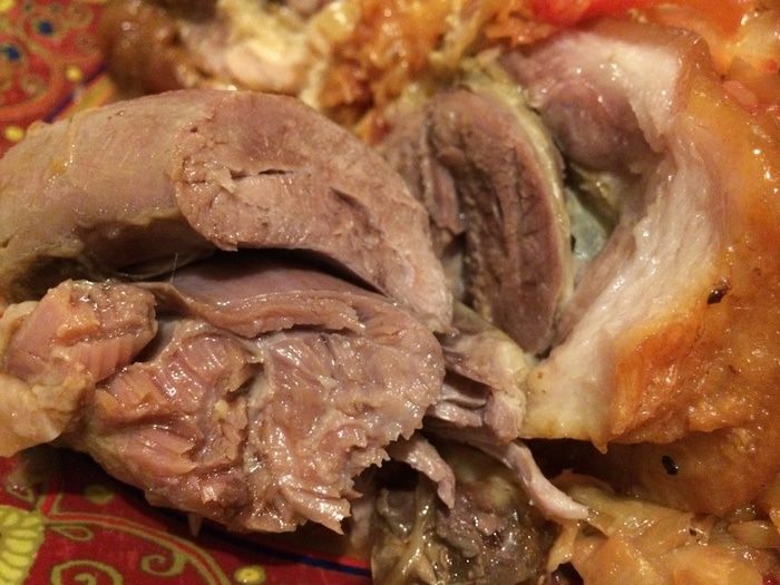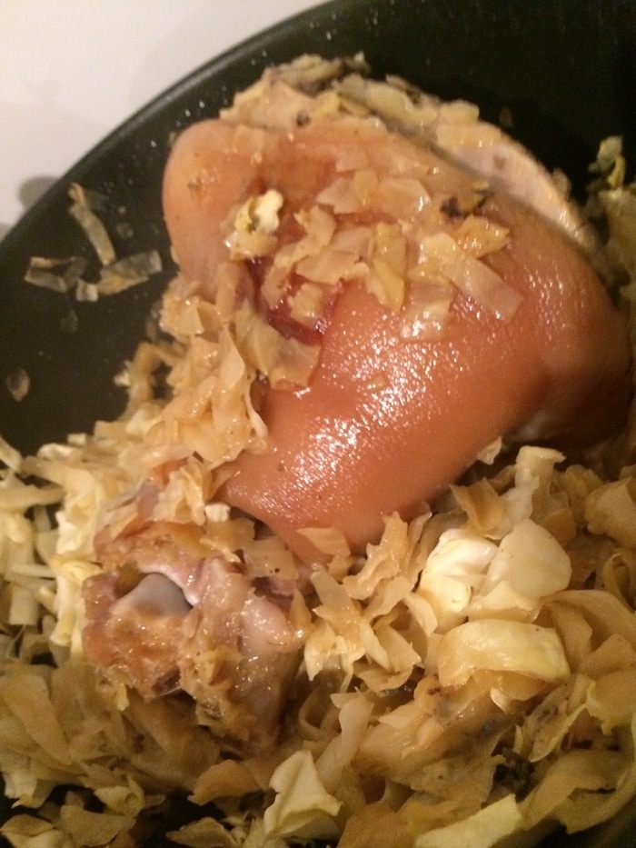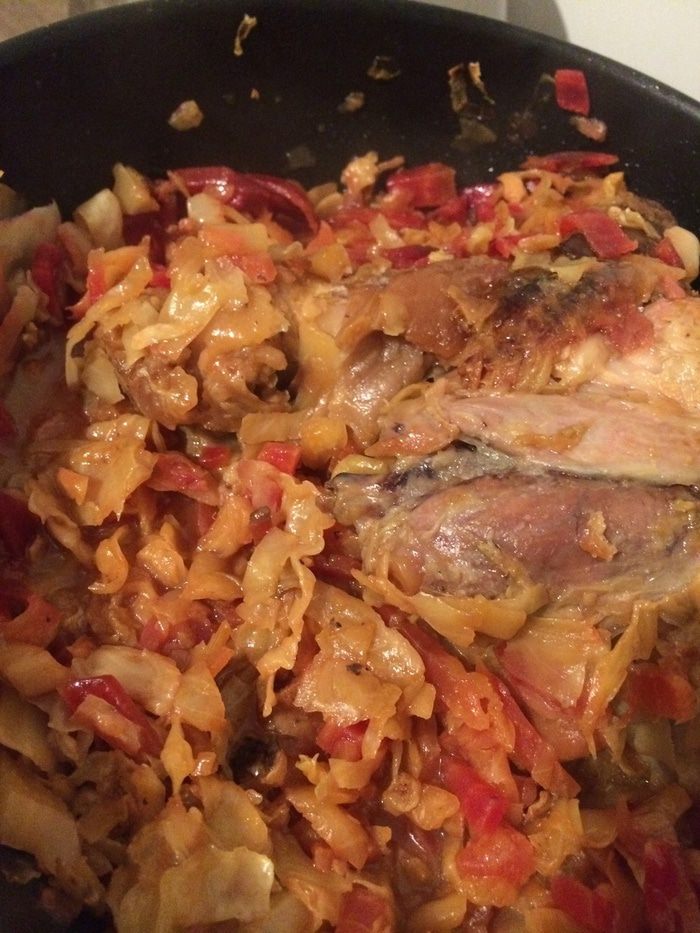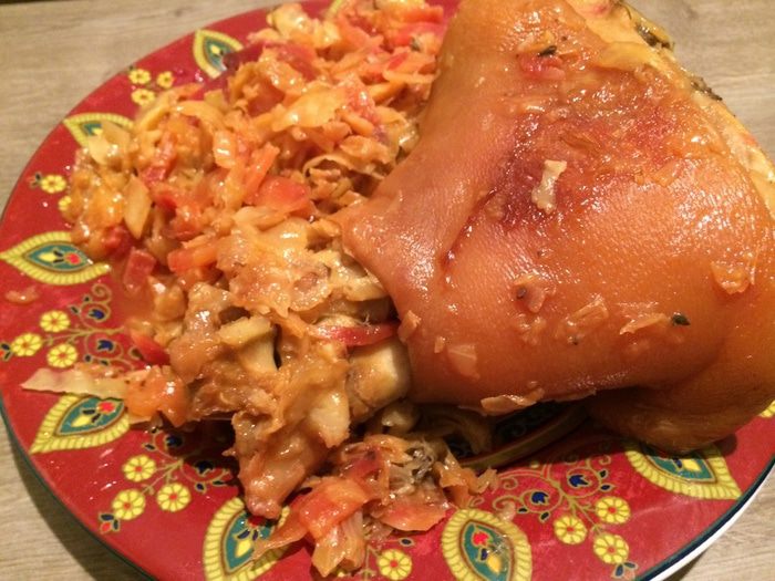 Переложить рульку в вок, нарезать туда капусту, поставить тушиться на 2 часа (добавить чуть-чуть воды).