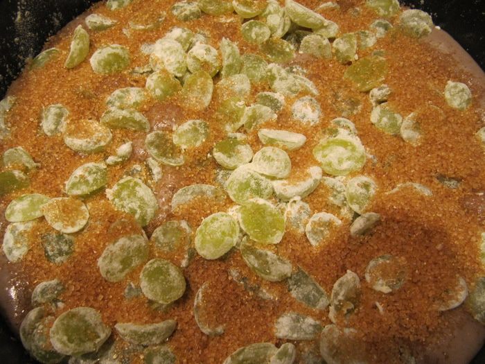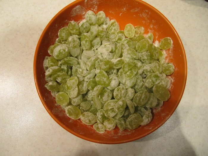 Виноград нарезать на половинки. Смешать с 1 ст. л. муки. Темный виноград больше подойдет для такого пирога. Но у меня был только зеленый, тоже получилось отлично!