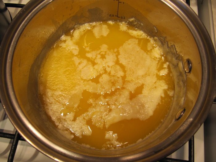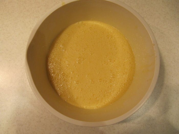 Растопленное сливочное масло взбить с сахаром и яйцами в светлую пышную массу.