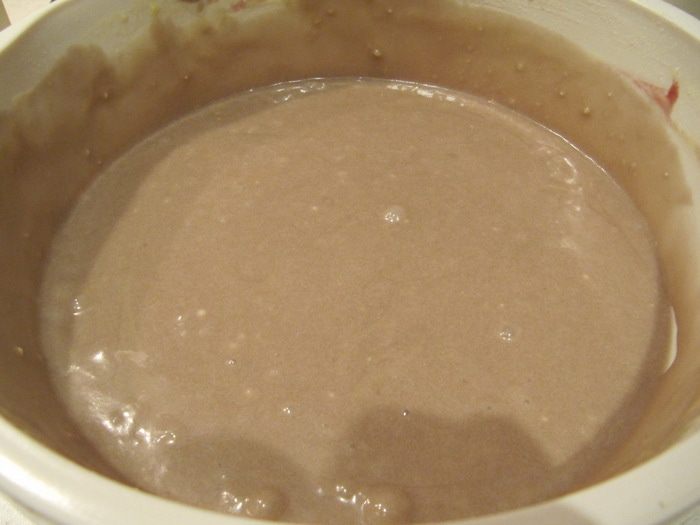В тесто добавить просеянную муку с разрыхлителем, соединить. Затем добавить выпаренное вино, перемешать.