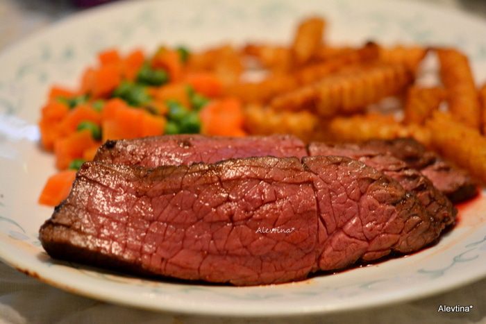 Смазать говядину со всех сторон. Готовим на гриле по 8 минут сторона или до полного приготовления мяса. Если есть, ставим в духовке режим бройл, или нагреваем духовку до 220°C.