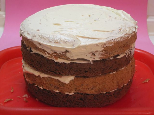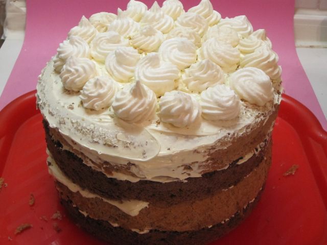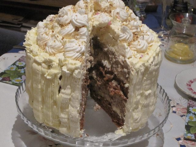 Она мне сразу заказала свой любимый торт и для гостей, и для своих однокурсников. Для дома сделала большой торт, рецепт которого выставляю, а два торта поменьше — в институт, один из них на фото. Большой торт никак не хотел фотографироваться, так что его фото только на пошаговых. Торт по этому рецепту готовлю уже несколько лет, и как-то он сразу вошел в нашу семью, да так и остался у нас, мы его полюбили, и он нам платит своей любовью: всегда пропекается, пышный, нежный. Рецепт бисквита классический, с моими добавками. Все 3 вкуса: шоколадный, ореховый и безе очень гармонируют друг с другом. Торт получается таким высоким, что сначала я даже не знаю, как его нарезать