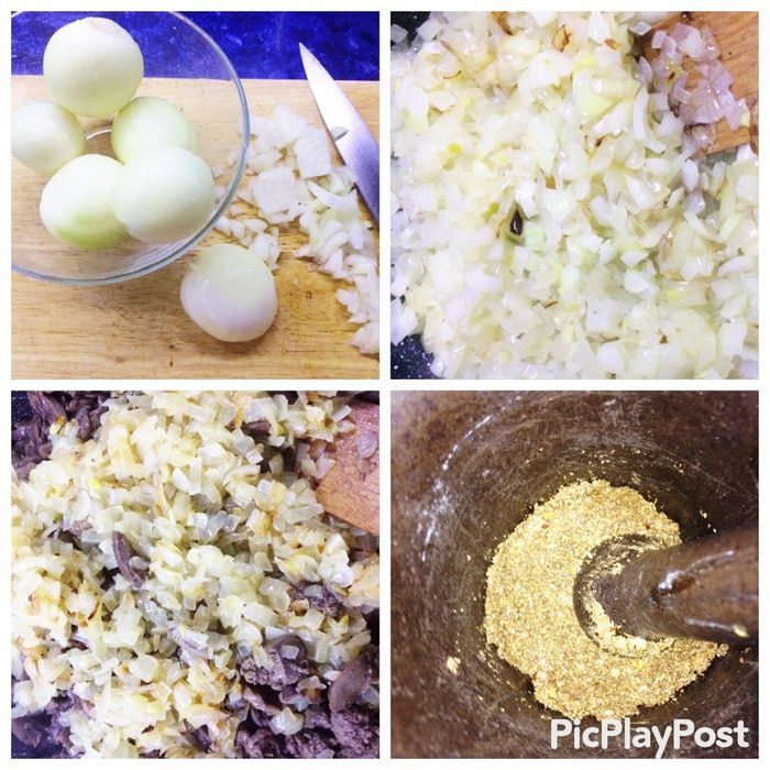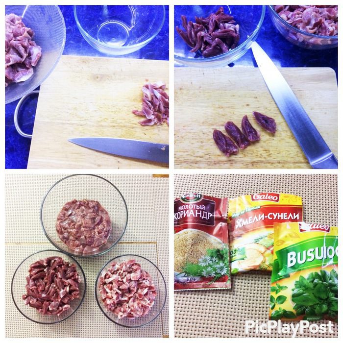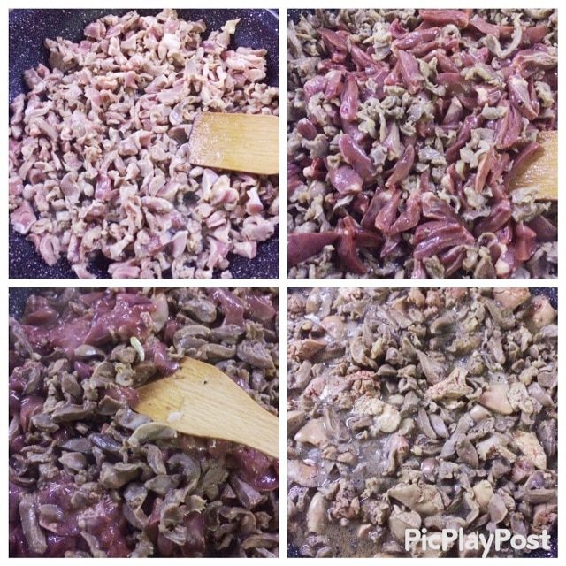 Пока потроха тушатся, в другой сковороде обжариваем мелко нарезанный лук до золотистого цвета. Чеснок пропустить через чеснокодавку, острый перец мелко нарезать. В ступке растереть чеснок, перчик, все специи до однородной массы и добавить 100 мл вина, перемешать. Когда жидкость выпарилась, добавляем жареный лук и смесь пряностей с вином и готовим еще минут 10 на сильном огне. Готовое блюдо посыпаем зернами граната и зеленью. Приятного аппетита! Вкусно как в горячем, так и в холодном виде.