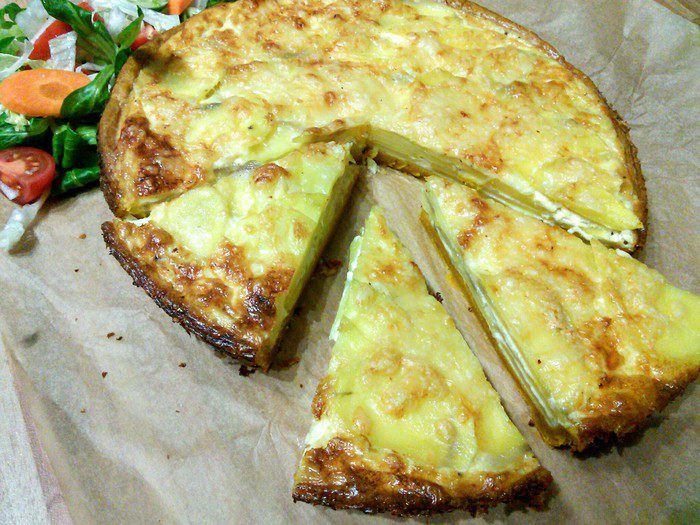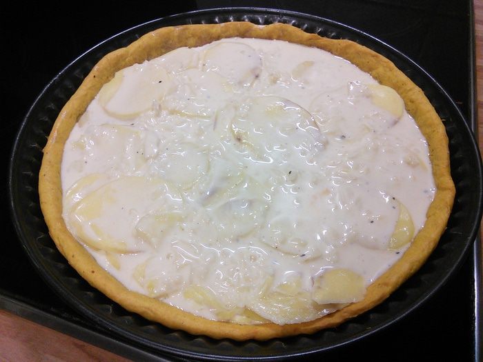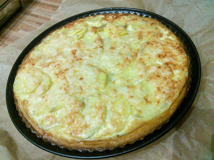Выпекать тарт при той же температуре около 30 — 45 минут. Важно поставить тарт в нижний отдел духовки, чтобы он не пригорел. Проверьте картофель на готовность, в противном случае увеличьте время выпечки на 5 — 10 минут. Зависит от сорта картофеля и тонкости его нарезки. Вот он красавец!