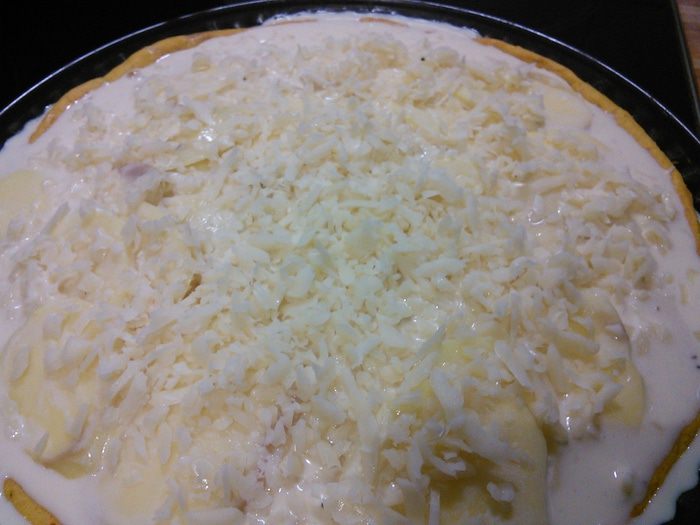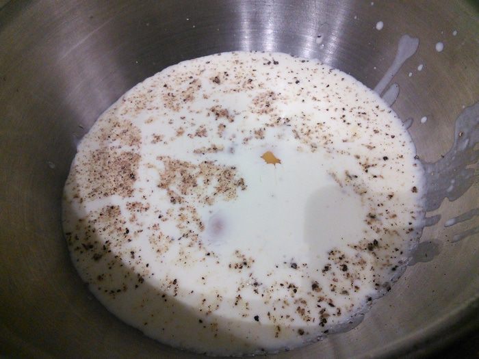 Теперь нам понадобится дуршлаг. Через него нужно слить сливки в миску, посолить и поперчить их, а также добавить щепотку мускатного ореха. Вбить яйца, разболтать и добавить половину натертого сыра.