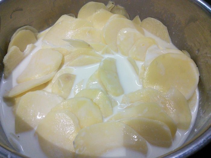 В это время займётся начинкой. Картофель очистить и тонко порезать кружочком. Удобно воспользоваться блендером с прилагающийся для этого насадкой. Кастрюлю со сливками поставить на огонь. Как только сливки закипят, снять с огня и выложить в них картофель. Накрыть крышкой и оставить в кастрюле с горячими сливками на 15 — 25 минут. Сыр натереть на крупной тёрке.
