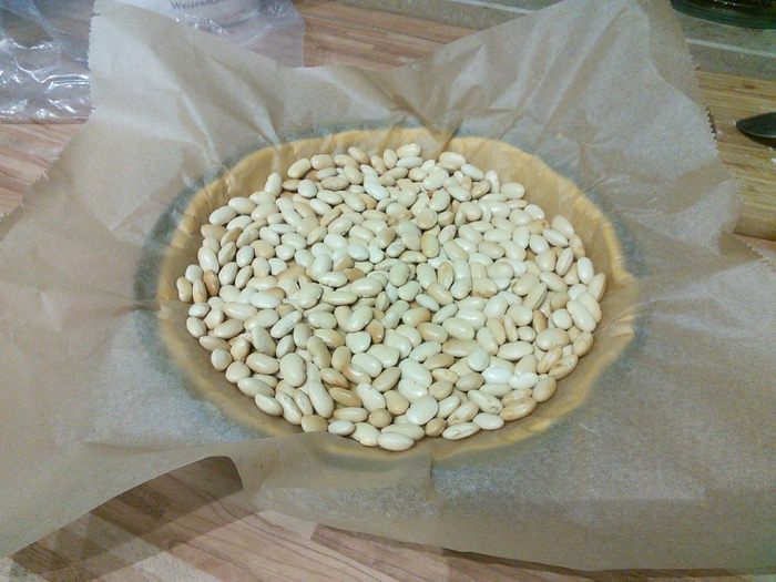 Разогреть духовку до 180С°. На тесто выложить лист пергаментной бумаги и разложить груз (фасоль или горох), слегка придавить и выпекать 20 минут. Затем достать из духовки и чуть охладить.