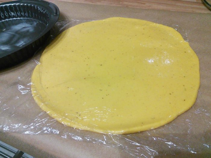 В блендере соединить муку, соль, свежемолотый перец, холодное масло, порезанное мелким кубиком и яйцо. Замесить тесто.