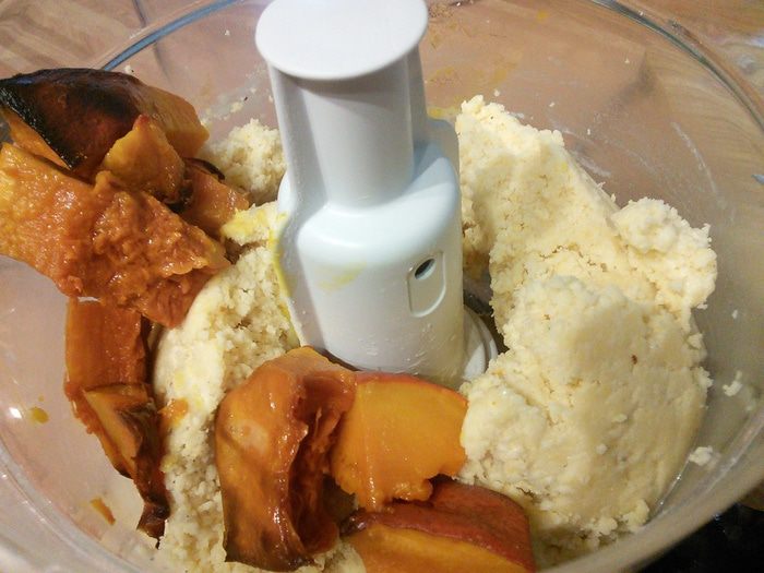 Тыква у меня запечённая заранее. Ставлю запекаться сразу некоторое количество тыквы, храню в холодильнике и по мере надобности добавляю в то или иное блюдо. Из общего количества нам понадобится 100 г готовой тыквы.