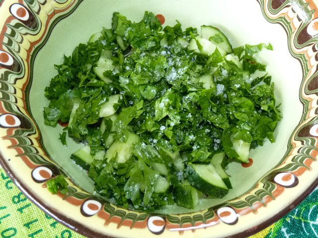 Измельчить петрушку, добавить к огурцам, посолить.