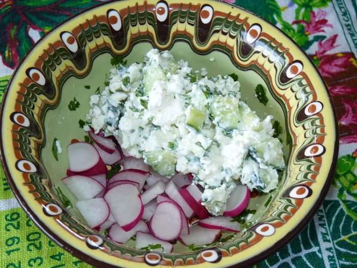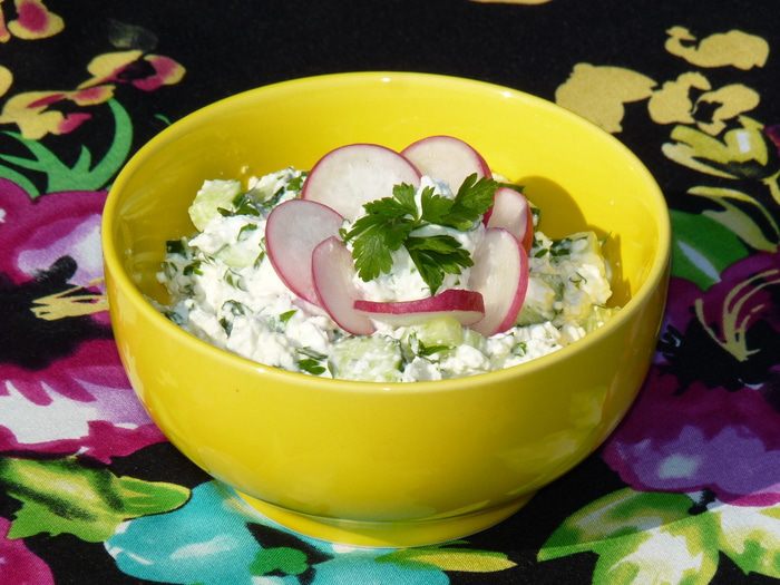 Легкий прохладный салат станет спасением в жаркие летние дни на даче, когда готовить не хочется, а кушать надо... Этот салат часто ем на полдник или вместо ужина . Майонез смело можно заменить сметаной. Угощайтесь!!!
