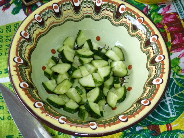 Огурцы нарезать на дольки.