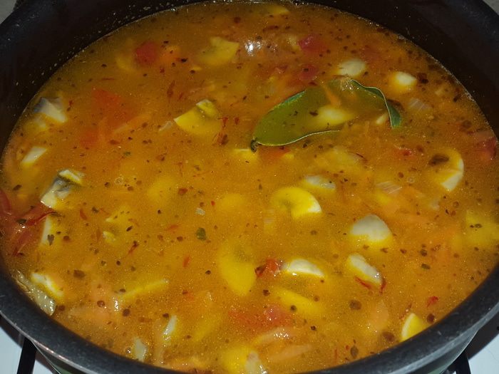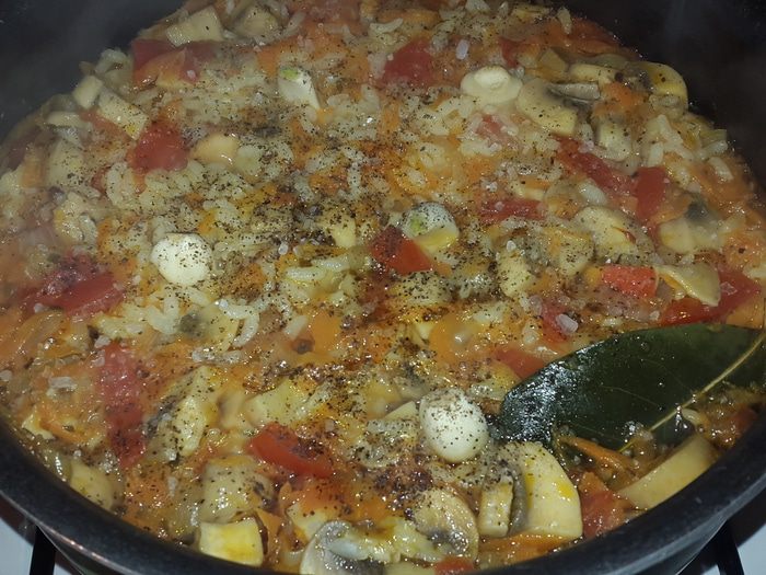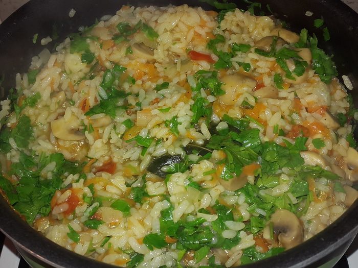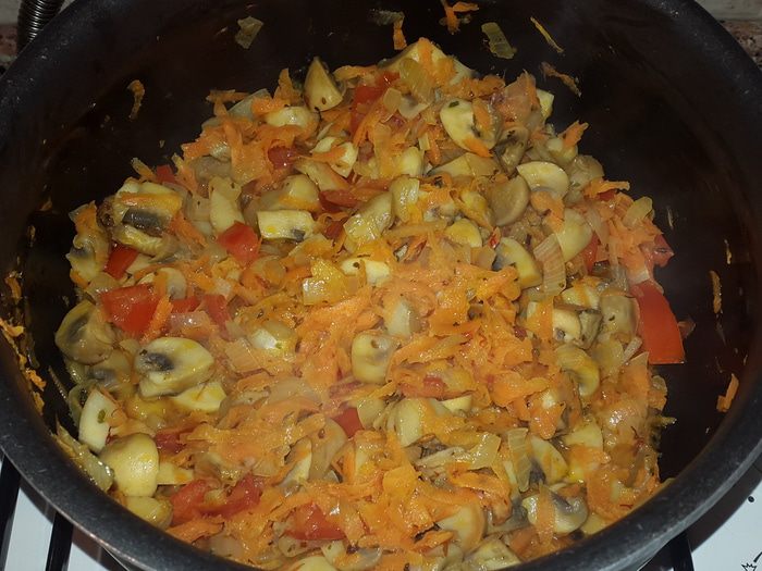 Морковь натираем на крупной терке и отправляем к луку с грибами, перемешиваем, убавляем огонь и тушим 3 минуты. Помидоры нарезаем кубиками и отправляем к остальным, солим, перчим, добавляем тимьян и шафран, перемешиваем и тушим еще несколько минут.