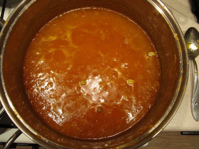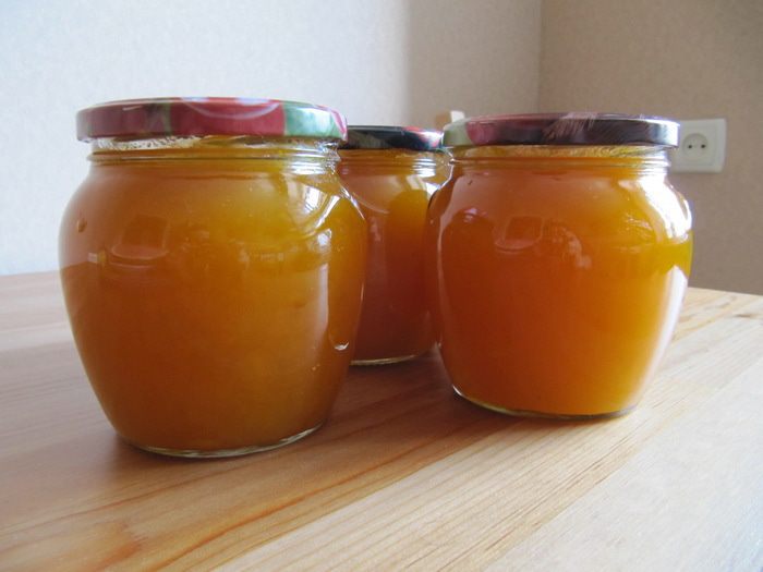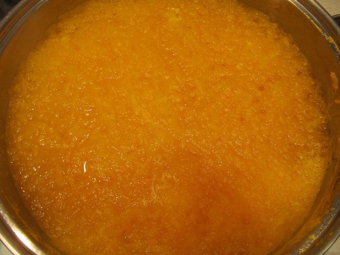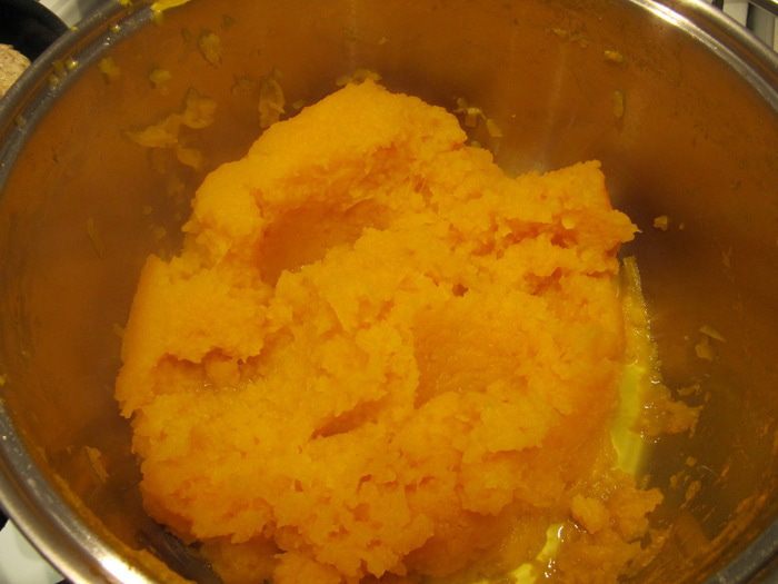 Засыпать мякоть тыквы сахаром. С апельсинов снять цедру и отжать сок. Добавить цедру, сок и коробочки кардамона к тыкве с сахаром. Довести на небольшом огне до кипения и варить при тихом кипении 7 минут. За 3 минуты до окончания варки добавить желирующее вещество (например, "Желфикс") и тщательно перемешать.