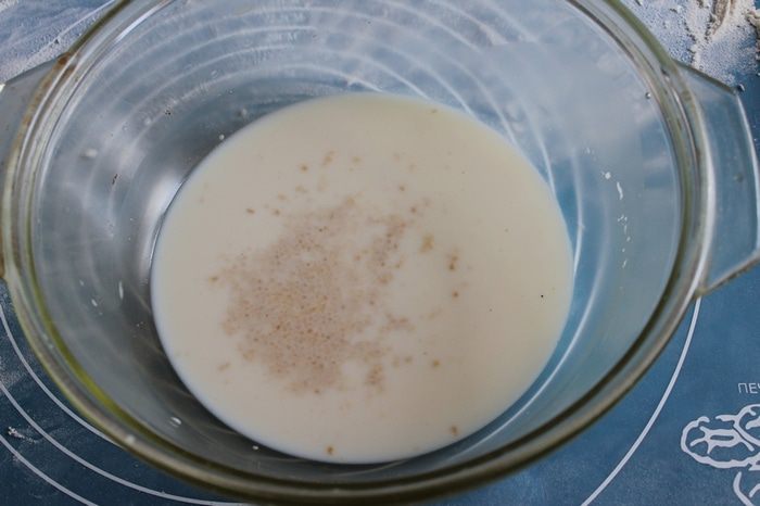 Приготовить опару: в теплое молоко добавить сахар, дрожжи, перемешать, накрыть и оставить на 10-15 мин.