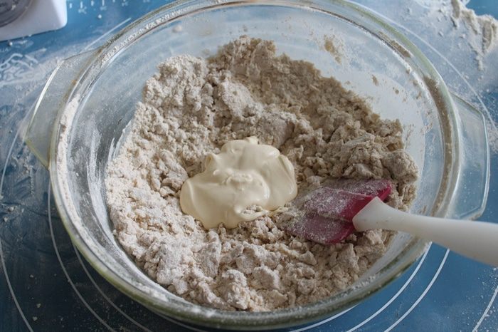 Влить опару, добавить сметану и замесить тесто, вымешивать 10-12 минут руками, тесто должно получится немного липковатое, но отставать от рук. При необходимости добавить немного молока или воды.