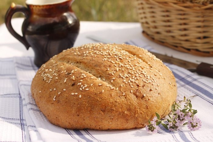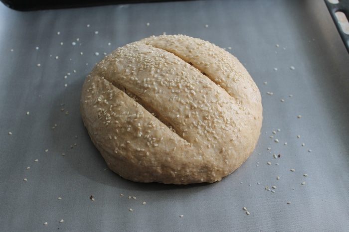 Сделать пару разрезов перед выпечкой, смазать хлеб молоком и посыпать кунжутом.