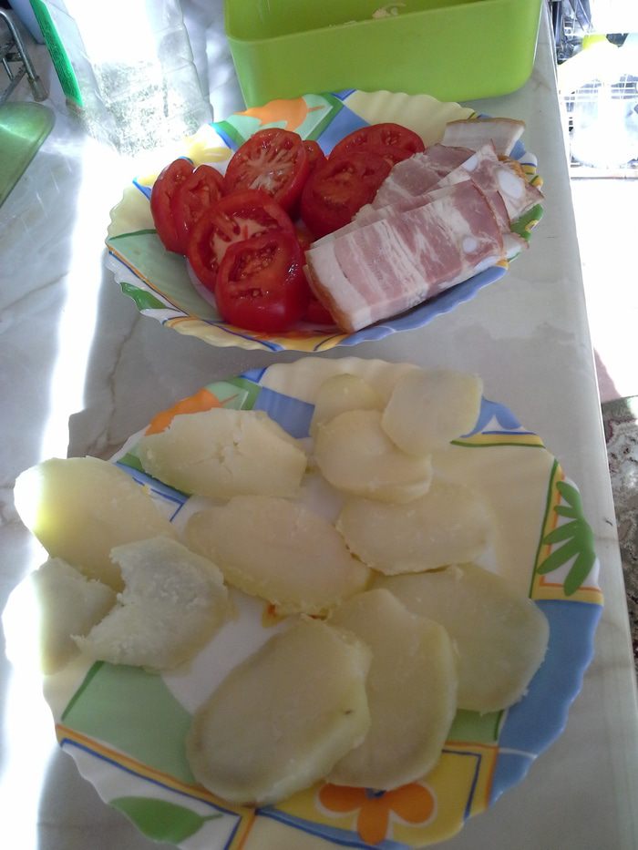 Картофель, помидоры нарезать колечками.