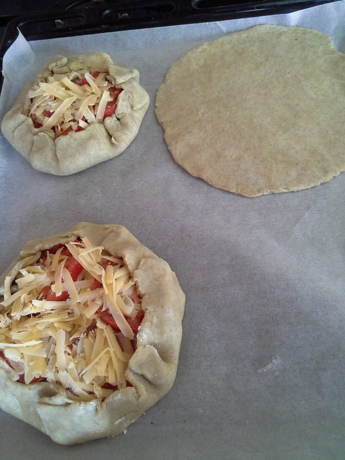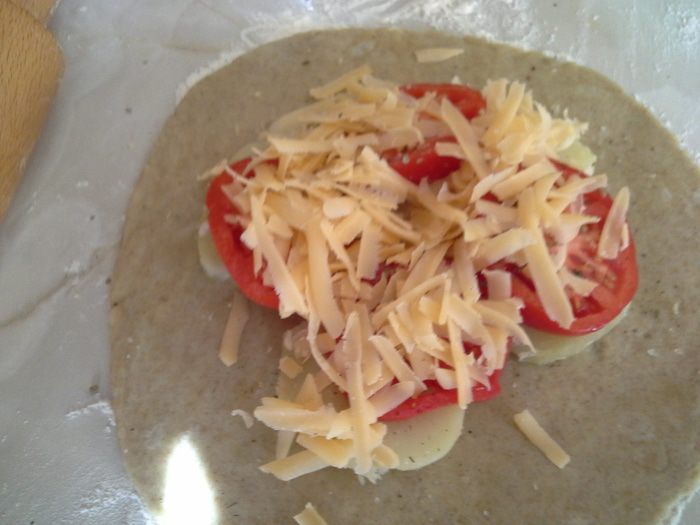 Раскатать в круг в центр картофель,сверху помидоры,посолить,сыр и собираем по бокам.