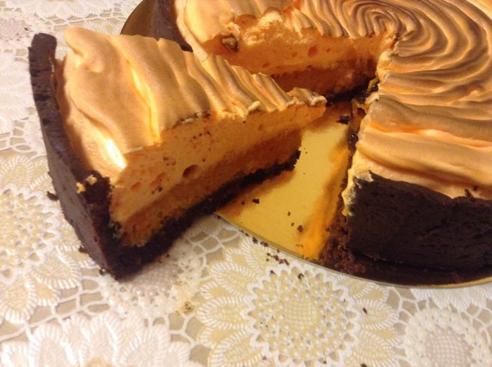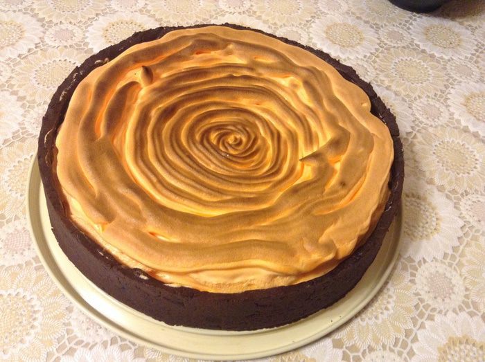 Меренга: слегка взбить белки с сахаром поставить на водяную баню, помешивая довести до 50С, снять, добавить лимонный сок и краситель (по желанию) взбить до пиков переложить в мешок отсадить на пирог. Я ставила под гриль на 3 минуты. Если его нет то при 150С где то минут на 10, чтобы меренга схватилась.