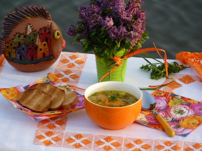 Наше семейное увлечение рыбалкой предполагает обилие речной рыбы в рационе и изобилие различных способов ее приготовления... А так как наша дача на берегу озера(тут и ловим, тут и готовим, тут и угощаем), то все новые рецепты испытываем на друзьях, пока они довольны . Скажу по секрету: речную рыбу готовлю, но не ем, зато очень люблю блюда из икры. Рецептов из икры у меня в запасе великое множество, сегодня предлагаю суп овощной с икрой, скажу сразу- может необычно, но вкусно! Овощи можно варьировать по вкусу и количеству. В рецепте я указала укроп, но он еще не вырос, поэтому в этот раз я использовала петрушку.