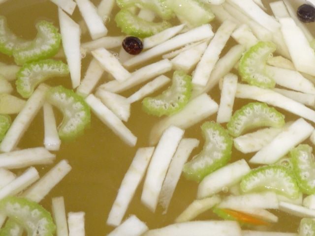 Варим почти до готовности. Добавляем перец горошком и лавровый лист.