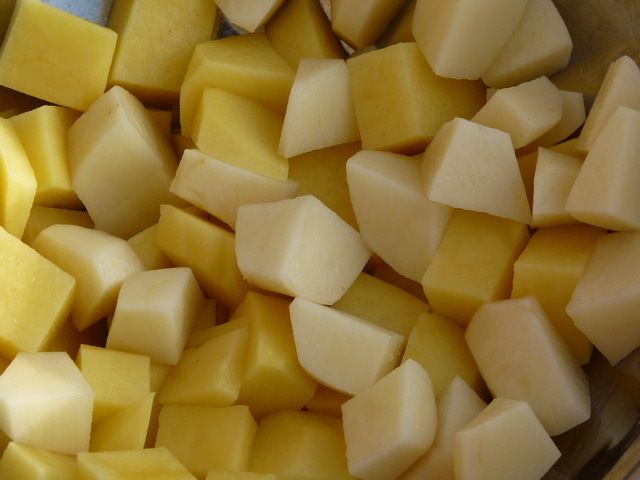 Нарезаем картофель мелкими кубиками и варим 5 минут в подсоленной воде.
