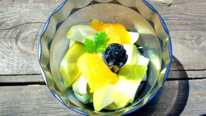 Добавьте теплой воды, 50-100 мл зависит от сочности яблока и огурца. И все измельчите. Можете использовать погружной блендер, так смузи будет более однородней.