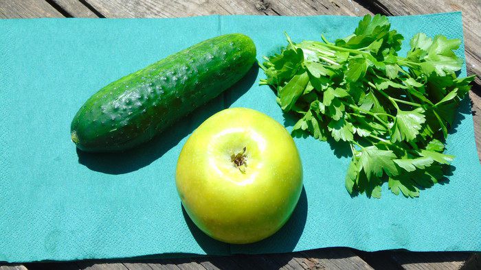 Петрушку тщательно промойте и обсушите. Огурец очистите. Яблоко нарежьте дольками и удалите сердцевину.