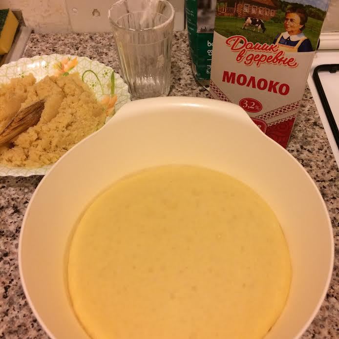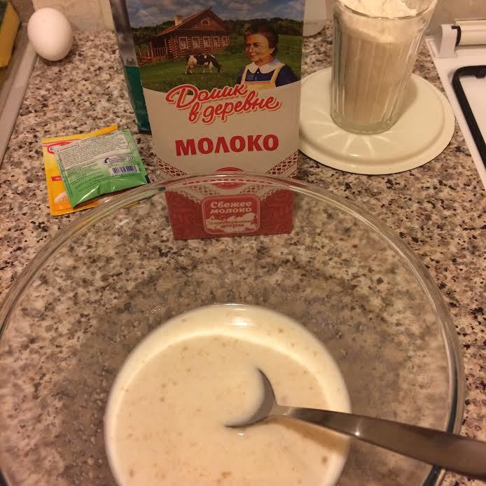 В теплом молоке «Домик в деревне» развести дрожжи, ванильный сахар, соль и сахар.