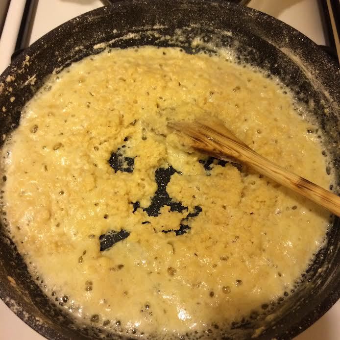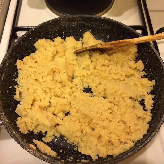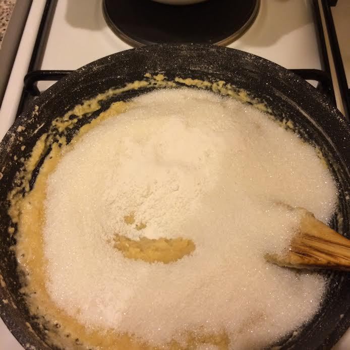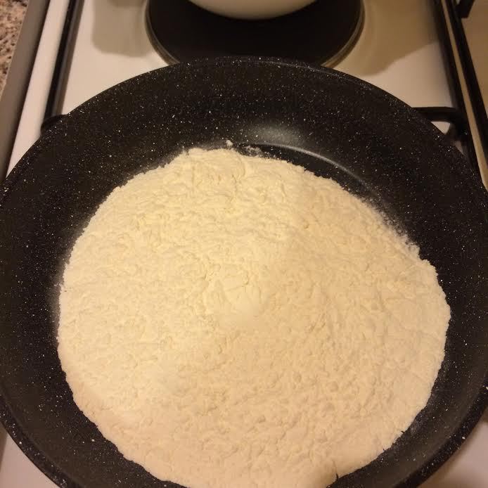 Начинка: муку просеять на сухую сковороду и на медленном огне, постоянно помешивая, довести до золотистого цвета.