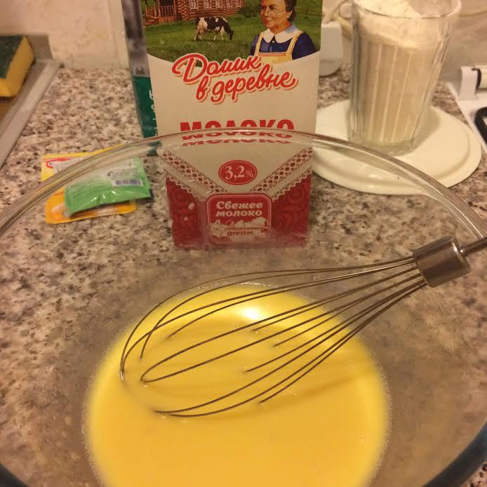 Добавить желток комнатной температуры и растопленное сливочное масло, слегка взбить венчиком.