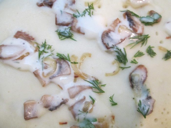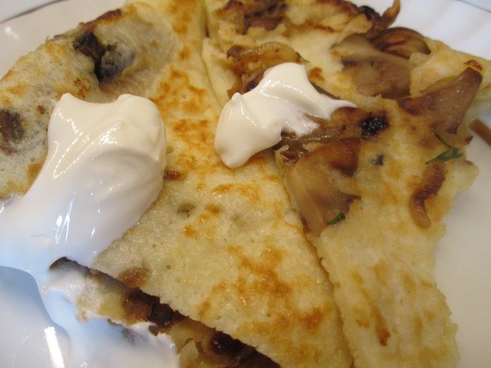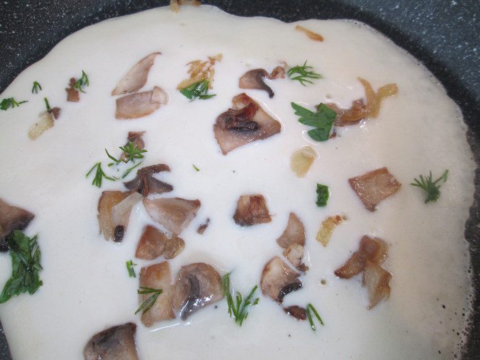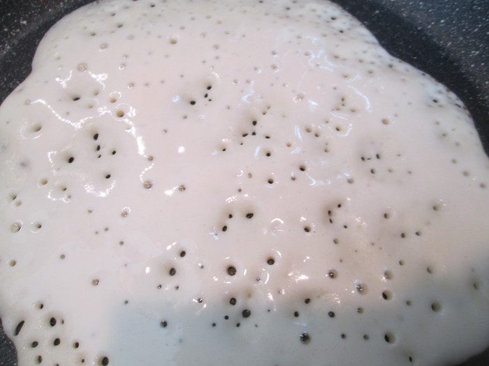 Теперь приступаем к тесту: взбиваем в блендере яйца. Продолжая взбивать на той же скорости добавляем кефир и все сухие ингредиенты: соль, соду, сахар, муку и получаем сначала густое тесто, как на оладьи. Далее осторожно тонкой струйкой добавляем кипяток, продолжая взбивать. В конце добавляем растительное масло, перемешиваем и даем тесту немного постоять.