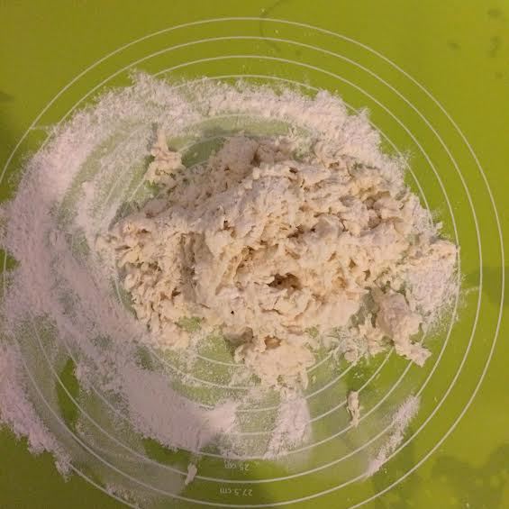 Присыпать доску (коврик для выпечки) 1 ст. л. муки,выложить тесто и размять. Тесто должно стать шелковистым на ощупь.