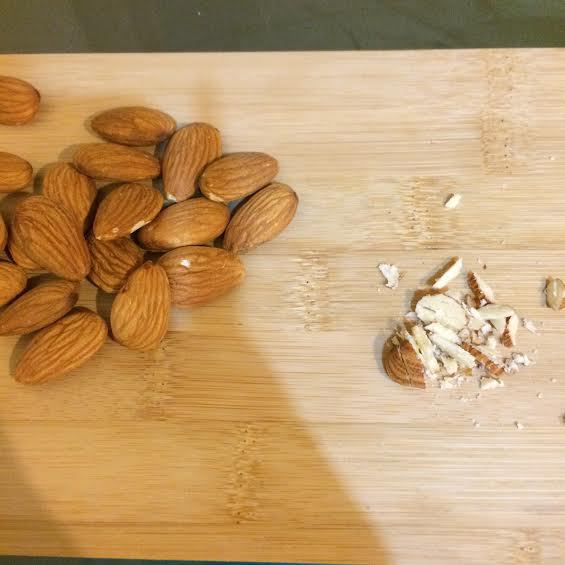 Посыпаем миндалем и сухариками.