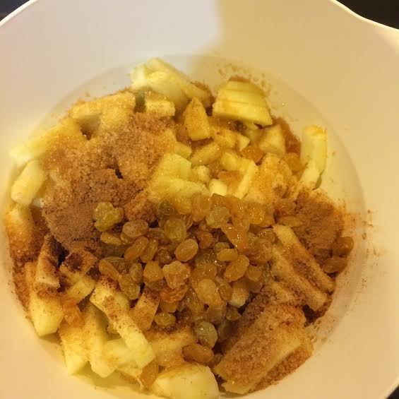 Яблоки очистить и мелко нарезать. В миске смешать яблоки, сахар, корицу, изюм, 2 ст. л. рома.