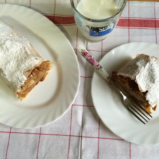 Рулет смазать 1 ч. л. растопленного сливочного масла.Выпекать 45 минут до золотистого цвета. Готовый штрудель достать из духовки, накрыть полотенцем и слегка остудить.