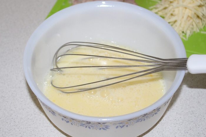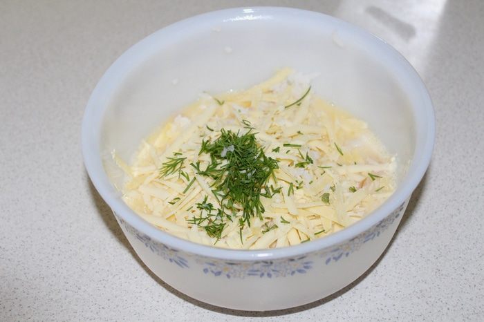 Куриную грудку нарезаем небольшими кусочками, сыр натираем на терке.
