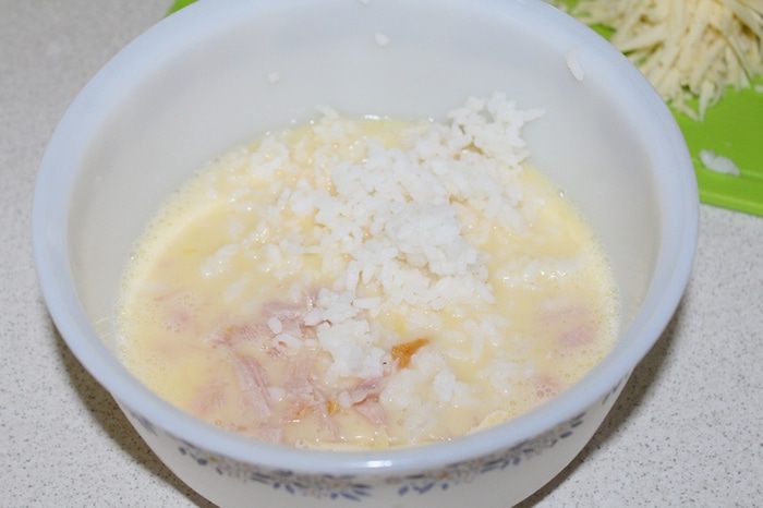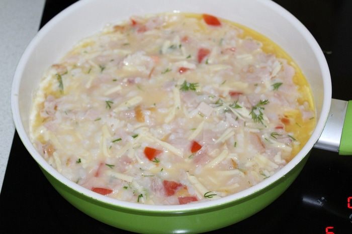 На разогретую сковороду с растительным маслом перекладываем яичную массу, разравниваем, 5-7 минут жарим на сильном огне для образования румяной нижний корочки, накрываем крышкой, огонь уменьшаем, готовим до момента, когда вся масса схватится.
