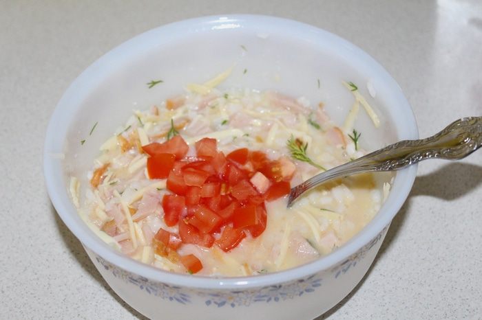 Нарезанный помидор, перемешиваем, не солим, грудка и сыр уже соленые.