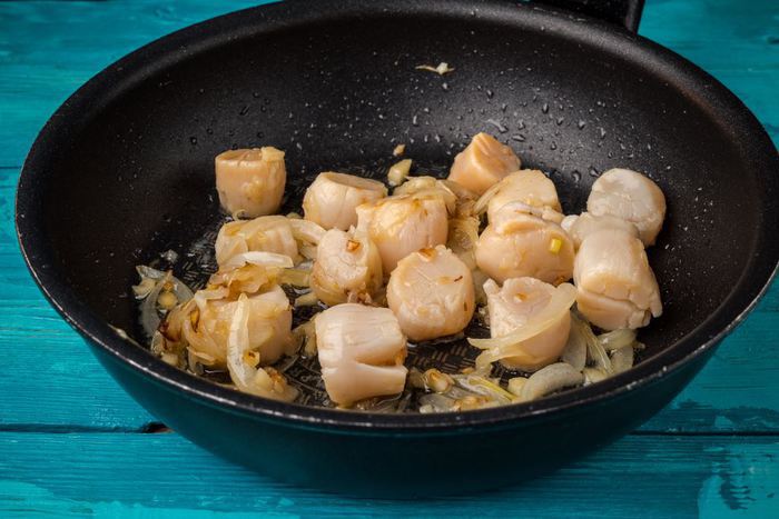 Добавляем гребешки к луку и чесноку. Добавляем по вкусу специи и готовим до золотистого цвета.